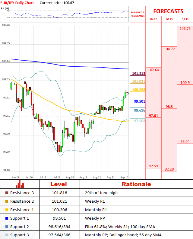 Pair has easily advanced towards 100, however was stopped by monthly pivot at 100.206 and currently hovers on the Bollinger band at 100.07. It seems that pair lacks momentum to advance further at the moment and it is likely we will see a pullback towards weekly PP at 99.501.