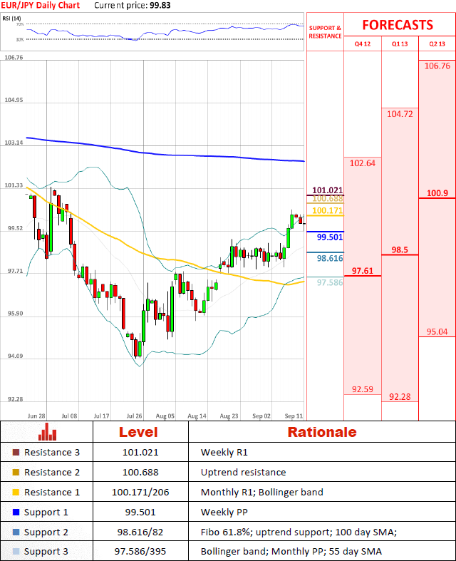Pair is continuing to hover depressed below 100. Technical indicators on 1 day and 1 week charts and cluster of resistance levels slightly above 100 suggest that pair will be pushed down, maybe even below 99 since the only support level on the way would be weekly PP at 99.501. However, amount of pending orders suggest that if pair would manage to breach 100 mark we will see a sharp appreciation of the pair.