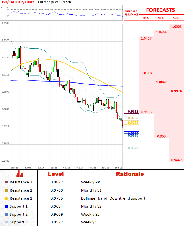 Pair is continuing to depreciate, but market participants continue to expect recovery of the pair even after it reached the lowest level in more than 12 months today. Stochastic indicator suggests we should see a bullish correction in the near future as Bollinger band and downtrend support at 0.9735 should pullback the pair, but lack of strong support levels below the current price increase probability of further depreciation of the pair.