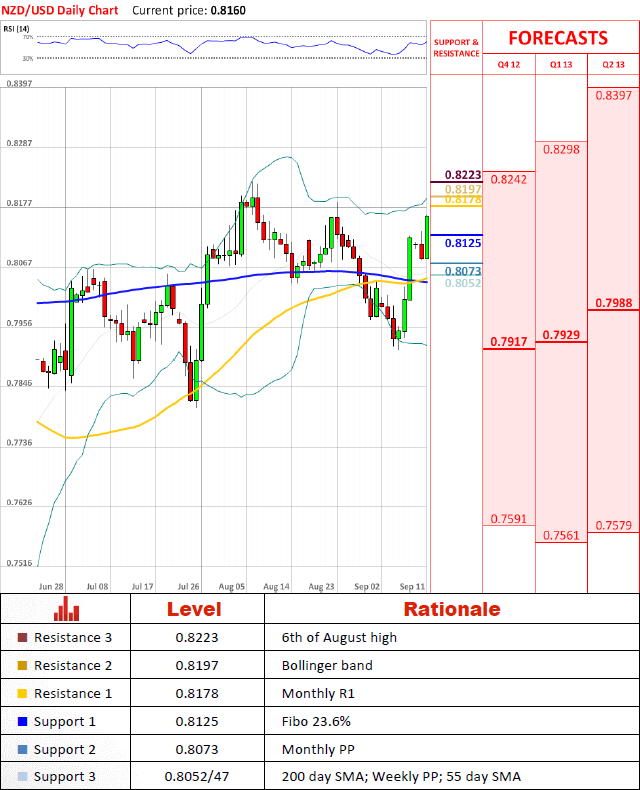 NZD/USD received a push from Fibonacci retracement at 0.8125 and tries to reach new high. However, Stochastic indicators suggests a bearish correction should take place in the near future. Significant resistance levels starting from 0.8197 strengthens probability of such developments in the near future.