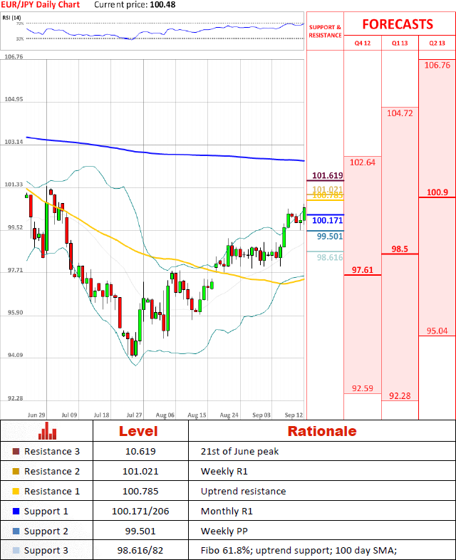 Pair managed to breach psychological 100 level today, however it has not gain momentum as expected indicating that traders are not yet convinced that this advancement will last long. It is likely that Bollinger band at 100.440, where the pair is now, and uptrend resistance at 100.785 will put some pressure on the pair slowing it down and eventually pushing it back below 100.