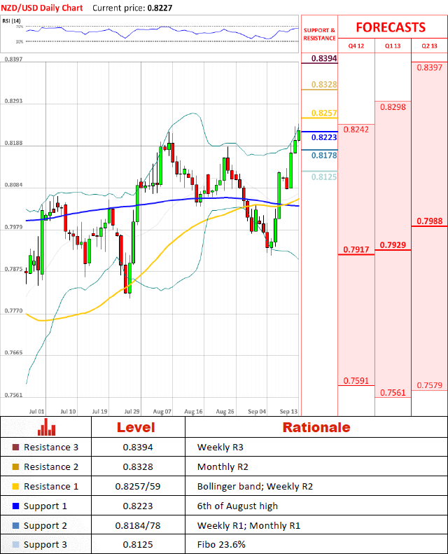 NZD/USD continues to appreciate and furiously tries to reach new highs. Currently pair is already trading at the highest levels since end of April. Pairs advance remains bounded by Bollinger band and pairs downside risk increases as Stochastic indicator points at possible bearish correction in the near future, which is likely to be slowed down at 0.8223 and 0.8184/78.