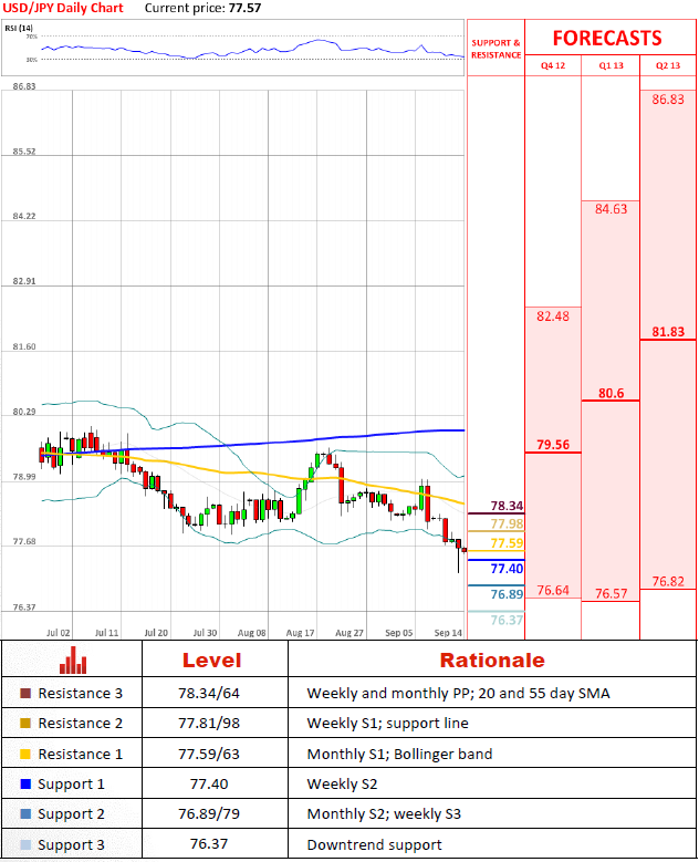 USD/JPY is still wary of going lower, as demonstrated by the pair's earlier performance, when it quickly retreated after falling below 77.40, which withstood downward pressure, but has been substantially weakened. Therefore the present dip may be extended down to 76.89/79, though should be worn down or terminated by this support area.