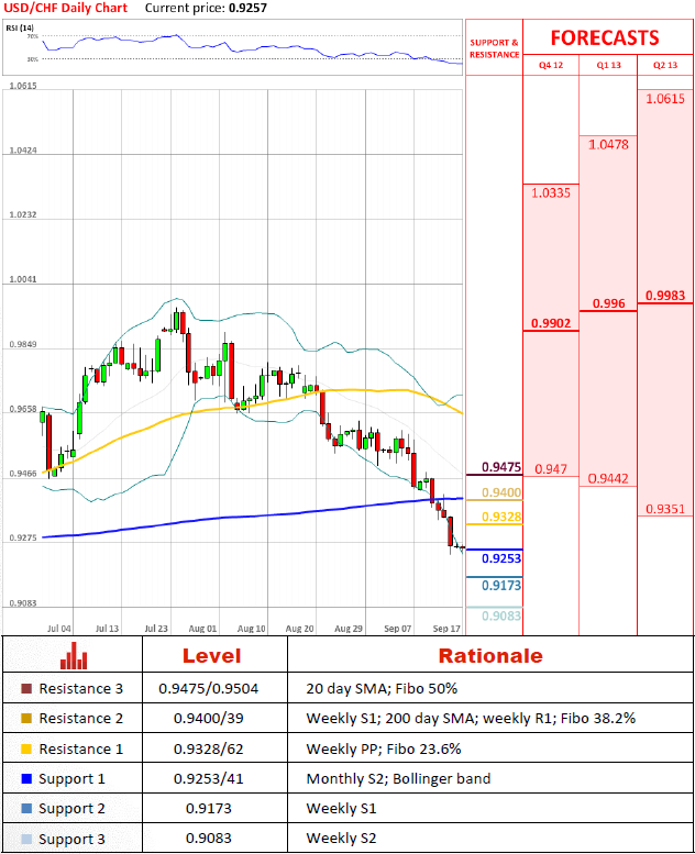 The currency couple continues to breach supports one after another, giving no signs that the present bearish momentum is weakening. USD/CHF may rebound from 0.9253 to make a short-term bullish correction up to 0.9328/62, though the outlook will remain negative, largely due to absence of any notable supports nearby that could have reversed the current trend.