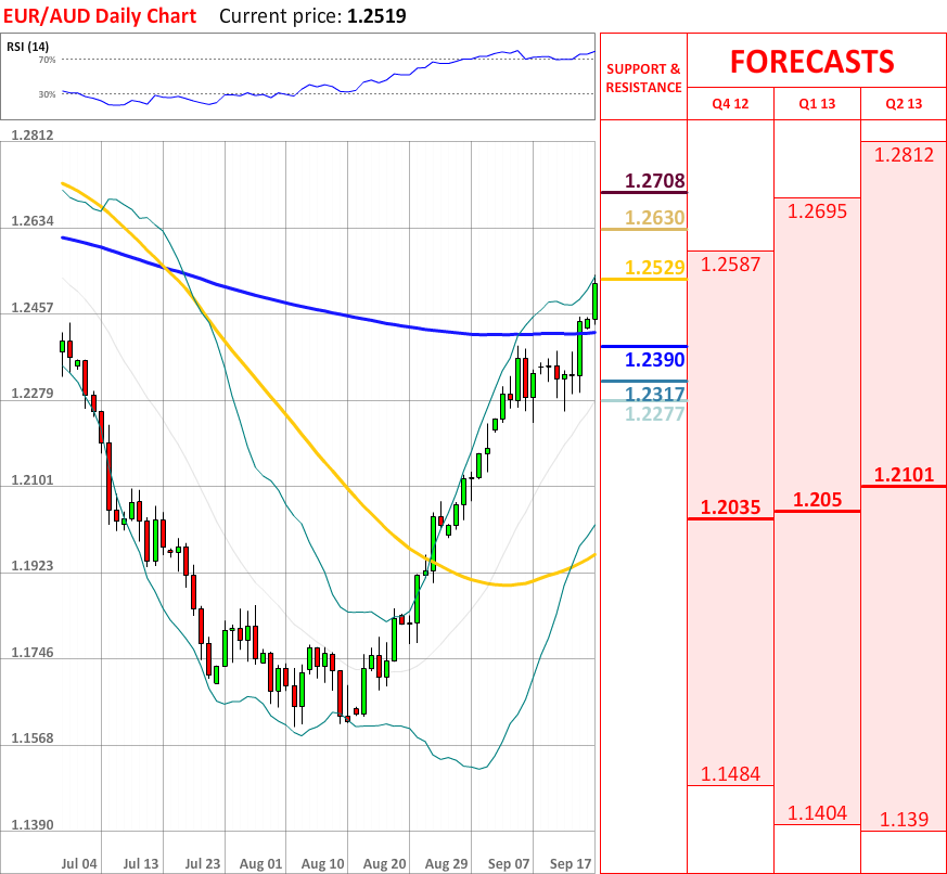 The bullish trend, which started three days ago, successfully managed to advance even further, and now the EUR/AUD currency couple confronts the upper Bollinger band at 1.2529, which might slow down the uptrend. In case it is breached, then the price might advance until the monthly R2 at 1.2630, which in turn is very likely to bring some bearish momentum. Additionally, RSI indicator shows a neutral signal, although the overall indicator outlook remains positive, therefore supporting the prevailing movement upwards.
