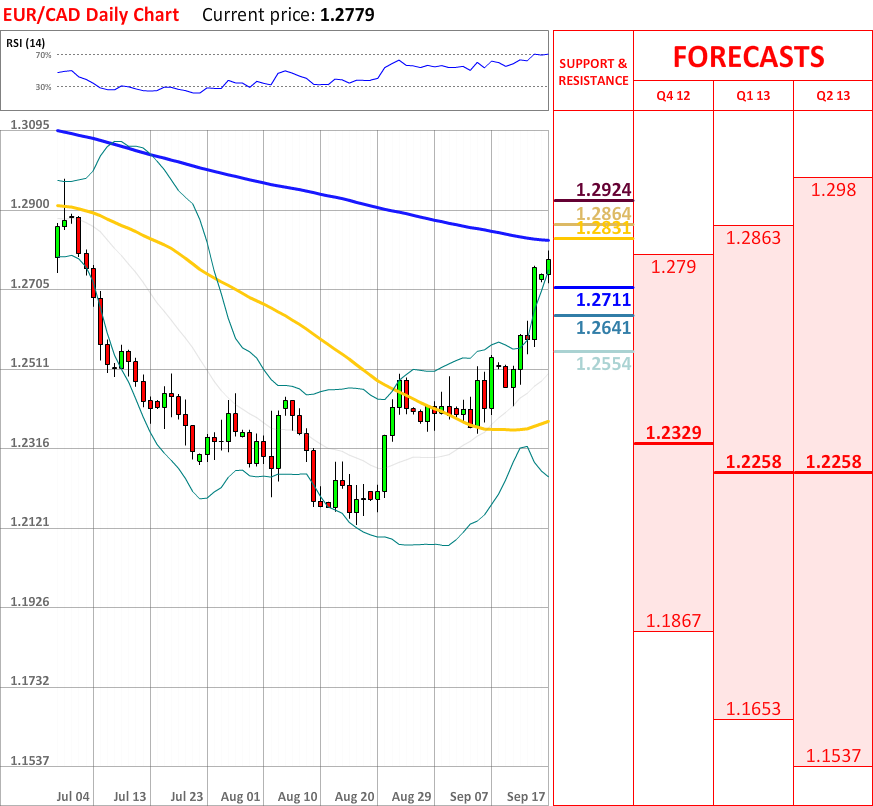 Today EUR/CAD experienced another bullish correction, and at the particular moment the currency pair approaches the 200-day SMA at 1.2831, which will probably reverse the prevailing movement upwards. If it fails to stop the rally, then next resistance at 1.2864 (weekly R1) might bring some bearish impetus. Moreover, the overall indicator outlook is neutral, therefore no significant trend reversals are expected in the nearest future. On the other hand, current supports are at 1.2711, 1.2641 and 1.2554, and so far there are no signs that they might be broken.
