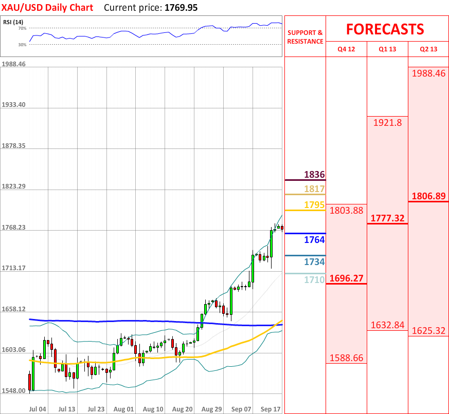 The interim bullish trend has ended, and today the XAU/USD exchange rate experienced a small bearish reaction, which at the particular moment is moving towards the monthly R2 at 1764, which is likely to bring some bullish impulse. In case is fails to slow down the downtrend, then next support at 1734 (weekly S1) will probably change the direction of the present movement downwards. In addition, RSI indicator now shows a sell signal, but the overall indicator outlook is still neutral.