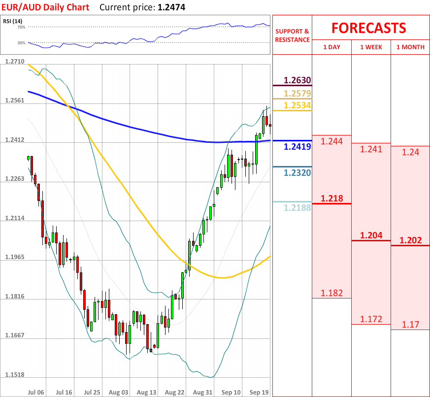 The bearish trend, which started yesterday, successfully managed to continue, and today the EUR/AUD currency couple has already managed to break down from the bullish price channel, and now the price is gradually approaching the 200-day SMA at 1.2419, which is expected to bring some bullish impulse. However, if it fails to stop the prevailing decline, then next support at 1.2320 (20-day SMA) is very likely to change the direction of the current movement downwards. Nevertheless, the indicator outlook is neutral, therefore no significant price movements are expected in the nearest future.