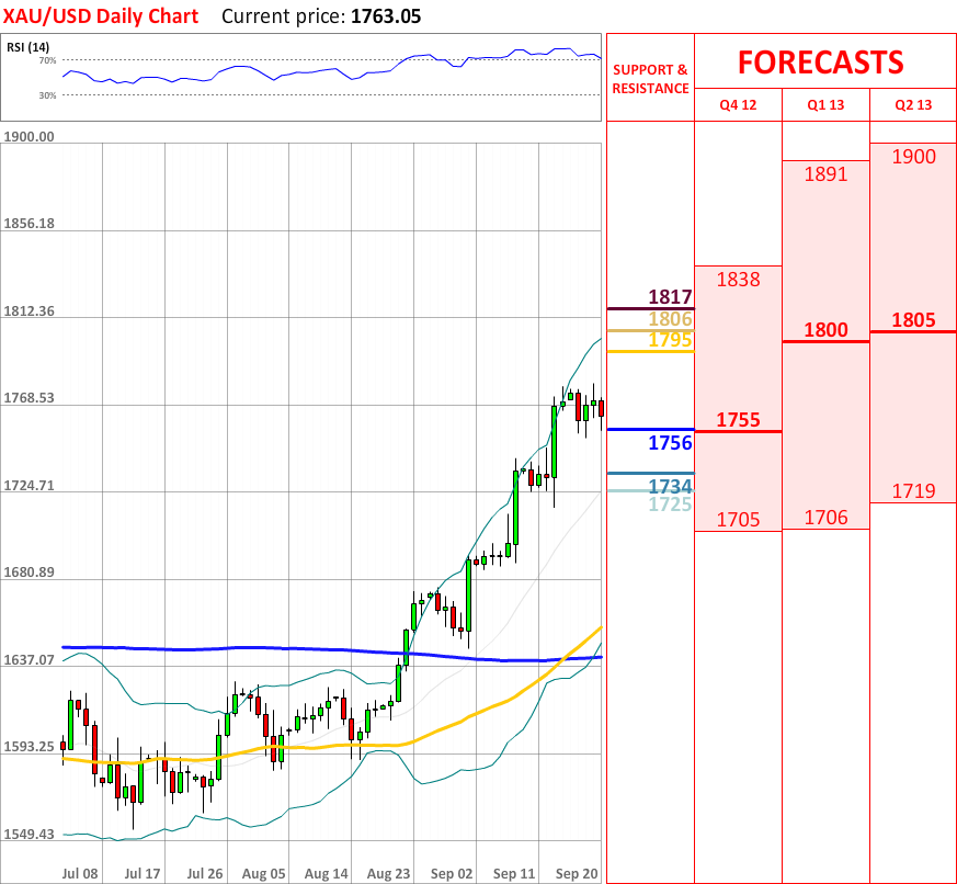 Today the XAU/USD exchange rate experienced a slight bearish reaction, which has already managed to breach the monthly R2 at 1764, and at the particular moment the price faces the weekly PP at 1756, which might bring some bullish impulse. In case it is broken, then the exchange rate might decline until the weekly S1 at 1734, which in turn is expected to reverse the prevailing movement. In addition, the indicator outlook is positive, and current resistances are at 1795, 1806 and 1817, and they seem to be safe for now.