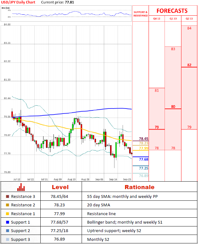 After closing below 77.99, the pair now approaches an additional support level at 77.68/57, where it will encounter a significant amount of buying pressure that is unlikely to let the price slide lower. Even if it does, 77.25/18 will aid in suppression of a dip, being partially formed by an uptrend support line, which has been respected by the market since October 2011.