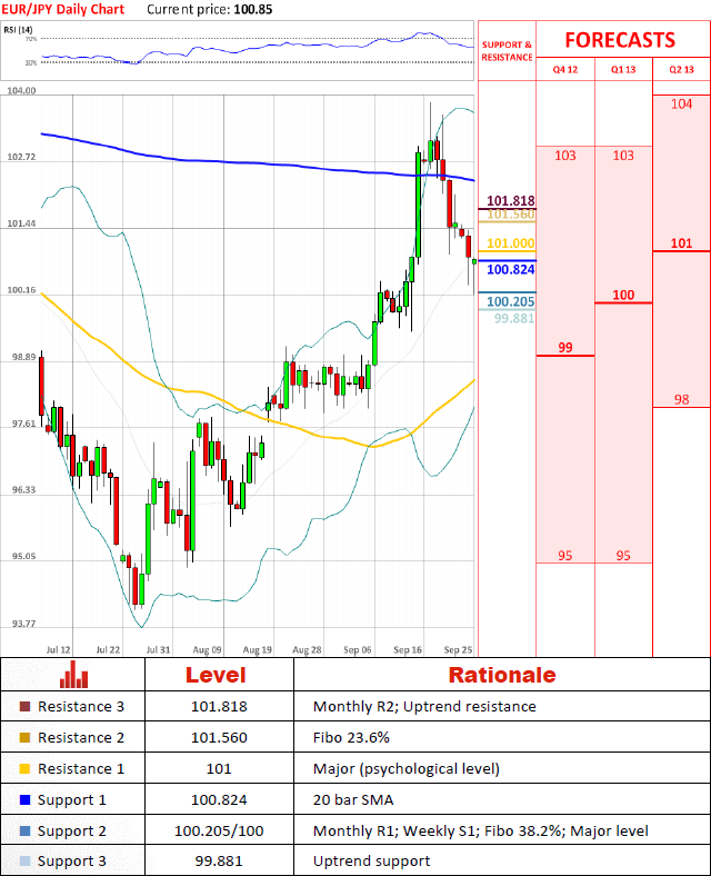 After bouncing from cluster of support levels at 100.205/100 pair is currently hovering slightly above 20 bar SMA at 100.824. Although Stochastic indicator suggests that appreciation of the pair should last a bit more, pair faces significant downside risk and another attempt to breach 100.205 should not be a surprise this week.