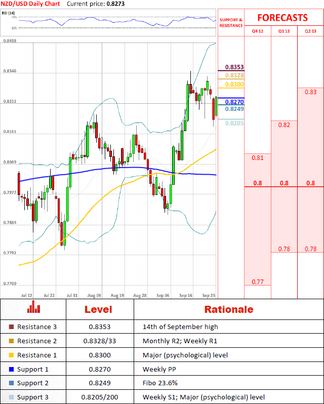Pair recovered all of its yesterdays losses and is back above weekly pivot point at 0.8270 after receiving a push from 0.8205/00. It is likely that this session is rather an exception to the rule in the medium term; pair might advance up to or maybe even breach 0.8300 temporary, but further depreciation of the pair seems to be much more believable.