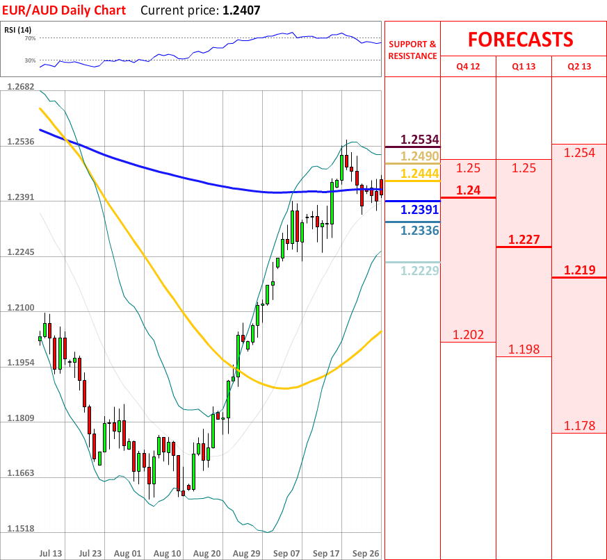OutlookYesterday the EUR/AUD currency couple bounced off the weekly PP at 1.2444, and now the price is about to test the 20-day SMA at 1.2391, which is expected to reverse the interim bearish tendency. In case it fails to stop the current movement downwards, then next support at 1.2336 (weekly S1) is very likely to bring some bullish impulse. Moreover, the RSI indicator still shows a neutral signal, and the overall indicator outlook is positive, therefore a trend reversal could be expected in the nearest future.