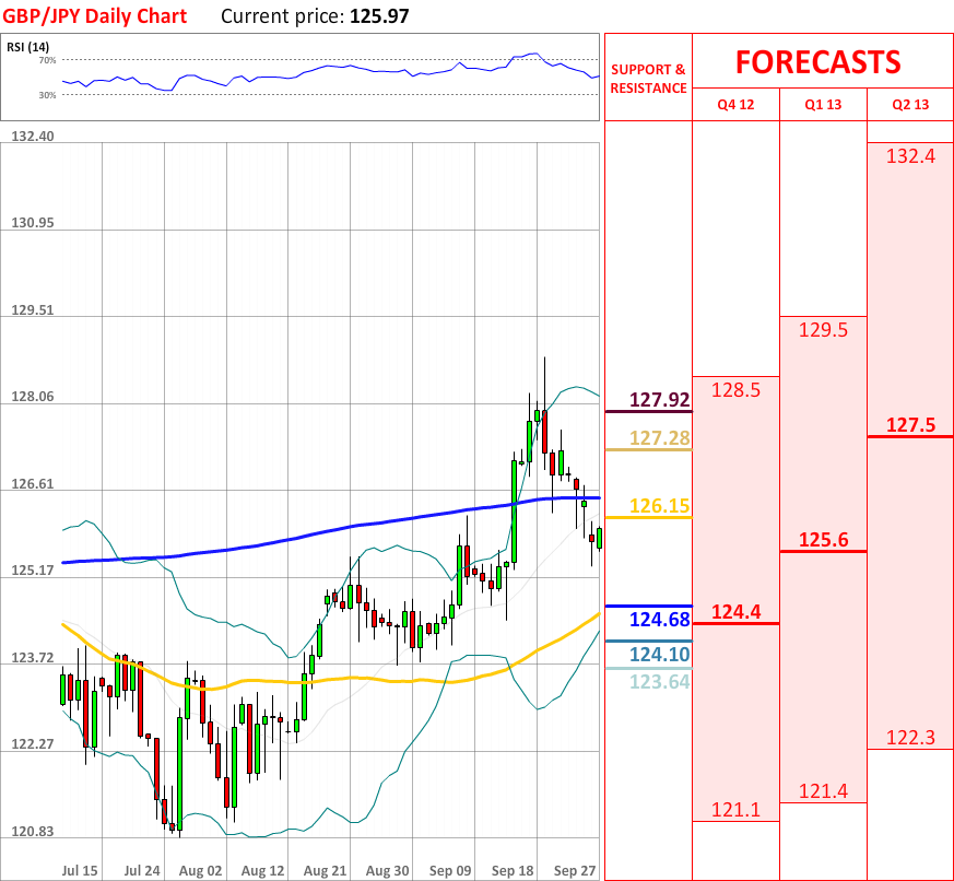 OutlookToday the GBP/JPY currency couple experienced a slight bullish correction, and at the particular moment the price faces the 20-day SMA at 126.15, which is likely to stop the prevailing rally from advancing further. However, if it is breached, then the price might advance until the weekly PP at 127.28, which will probably bring some bearish momentum. Nevertheless, the overall indicator outlook now is neutral, therefore no significant tendency reversals should be expected in the nearest future.