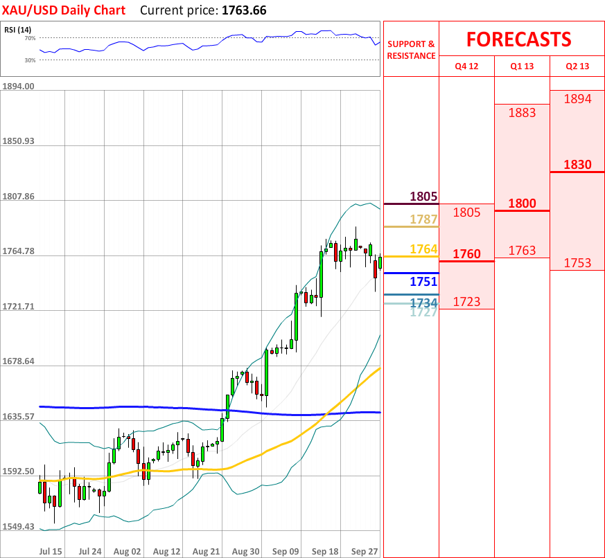 OutlookThe bearish tendency, which started a few days ago, did not manage to continue, and today the XAU/USD exchange rate experienced a bullish correction, and as for now the price confronts the monthly R2 at 1764, which will probably slow down the prevailing uptrend. In case it is broken, then the price is very likely to reach the weekly R1, which in turn might stop the current movement upwards. In addition, the overall indicator outlook is neutral, therefore no significant trend reversals are expected in the nearest future.