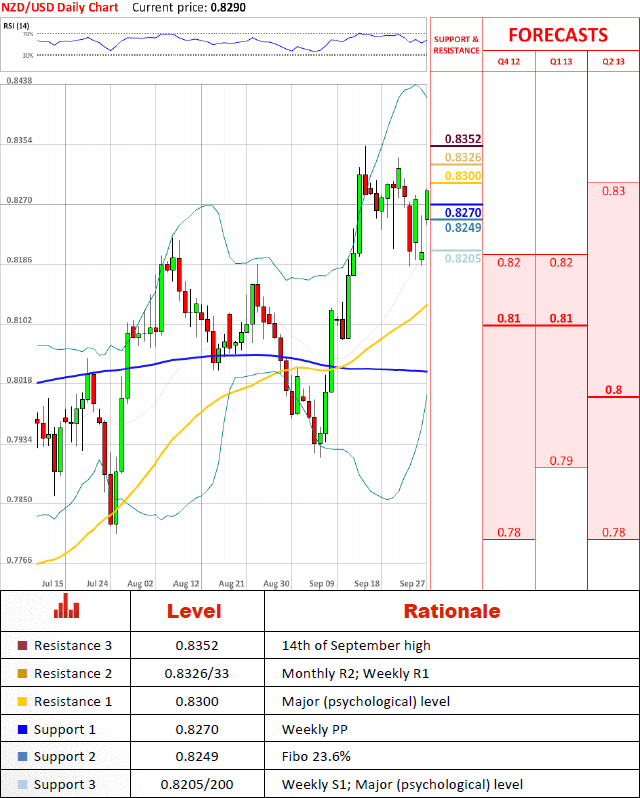 Pair is appreciating for the second day after hitting Fibonacci (23.6% of move since 5th of September) at 0.8249. It seems that this rally might continue even further up to monthly and weekly pivots at 0.8326/33 with slight break at major (psychological) level at 0.8300.