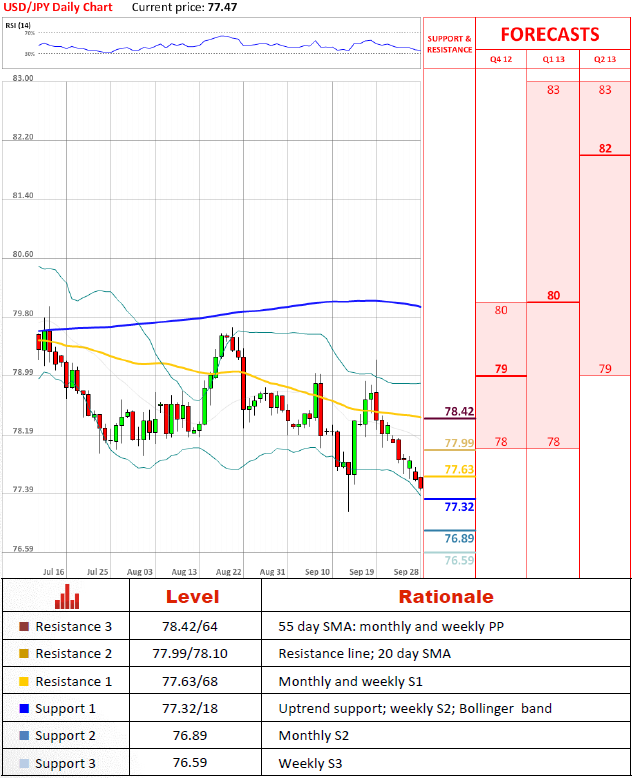 USD/JPY continues to slide down and has already left 77.68/63 behind. The next level is at 77.32/18—the last strong support en route to an all-time low at 75.57, as neither 76.89 nor 76.49 seem to be capable of halting the pair at the moment. The currency couple is nevertheless expected to stabilise soon and to rally despite "sell" signals of indicators on a weekly chart.