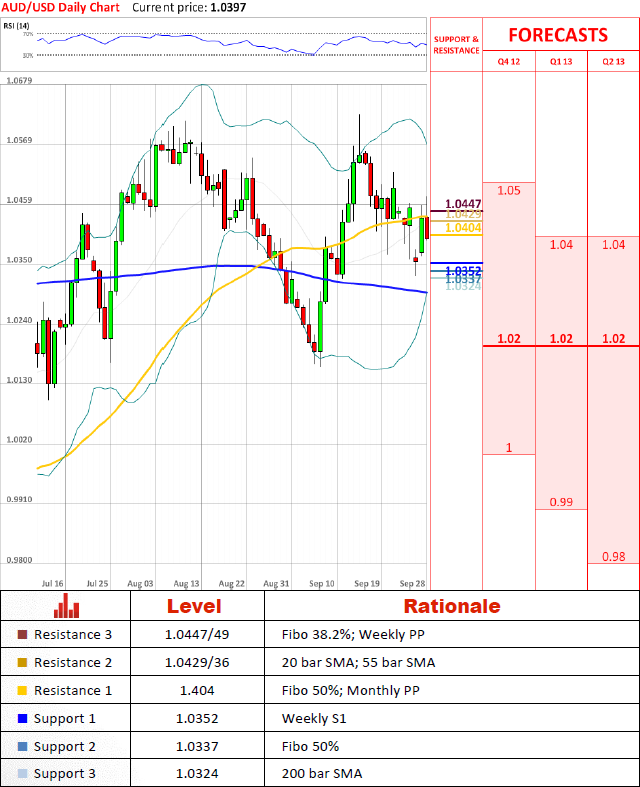 Recent developments allow us to believe that pair is range bound between weekly pivot (S1) at 1.035 and 1.045 and is currently depressed slightly below monthly pivot (PP)/Fibonacci retracement (50% of move since 6th of September) at 1.0404. As technical indicators point at appreciation of the pair it is likely it will bounce of the support levels below.