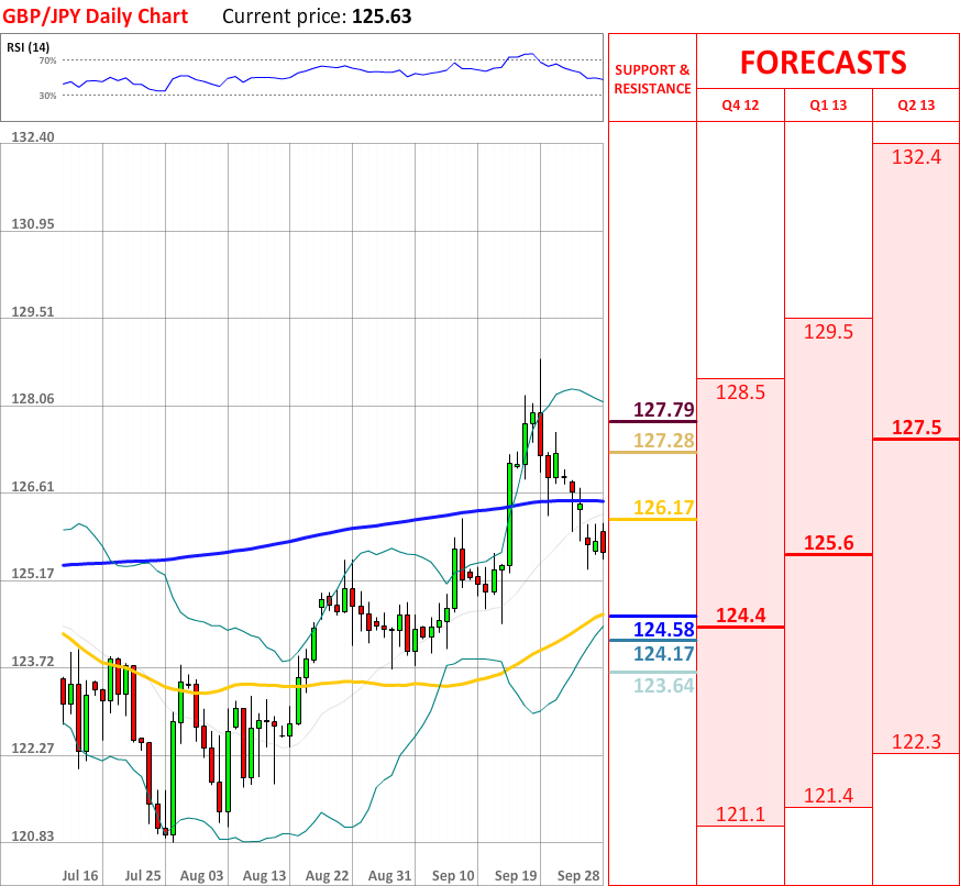 OutlookToday GBP/JPY experienced a significant bearish reaction, and at the particular moment the GBP/JPY currency pair is slowly moving towards 55-day SMA at 124.58, which will probably reverse the prevailing movement downwards. If it is broken, then next support at 124.17 (lower Bollinger band) is very likely to bring some bullish impetus. Moreover, RSI indicator shows a neutral signal, although the overall indicator outlook is positive, therefore tendency reversal could be expected in the nearest future.