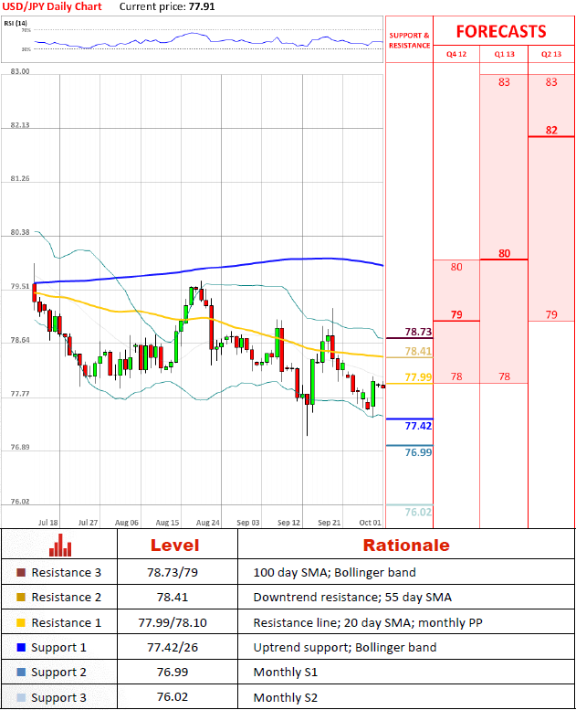 Range of USD/JPY narrows, as it is being contained by two converging lines. One of them has kept the price in a downtrend since March 15, while the other has underpinned the pair for nearly a year. Therefore we would expect a breakout of a downward sloping line due to support's seniority and a subsequent surge of USD/JPY above 78.41 en route to 79.65/79.