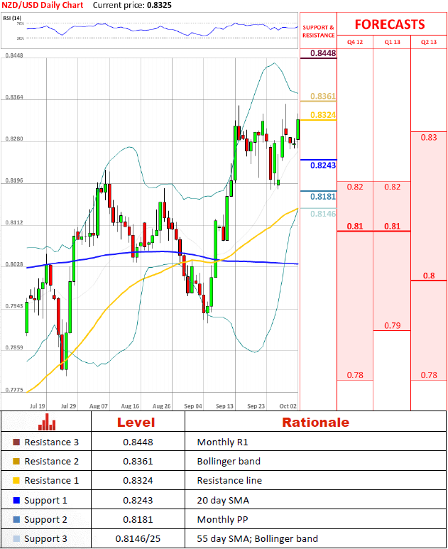 Since NZD/USD has lingered near the upper limit of the bullish channel for the last 16 days, it creates suspicion that the pair is forming a rising wedge pattern, downward breakout of which generally occurs more often than the upward one. The nearest support is at 0.8243, but is not deemed capable of halting the possible dip. Level at 0.8181 in this case should be a better estimate of the initial target and is the first possible point of a reversal.