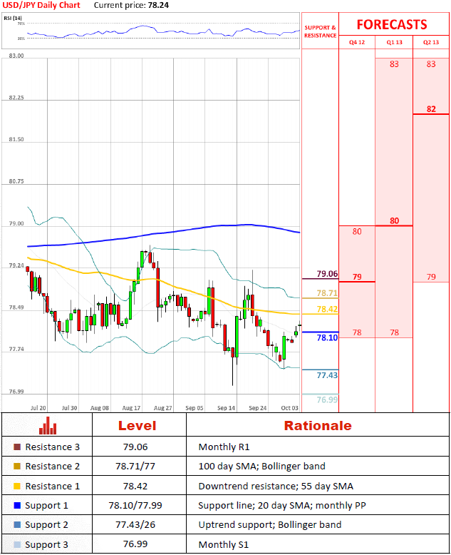 The currency pair is slowly approaching an edge of the bearish channel at 78.42 that lies overhead. There USD/JPY is likely to be capped, since technical indicators do not give a distinct signal. The upper shadow of the candlestick might extend up to 78.71/77, but only a close above it will ensure that the rally is not a false breakout. In the meantime, an interim resistance is at 78.10/77.99.
