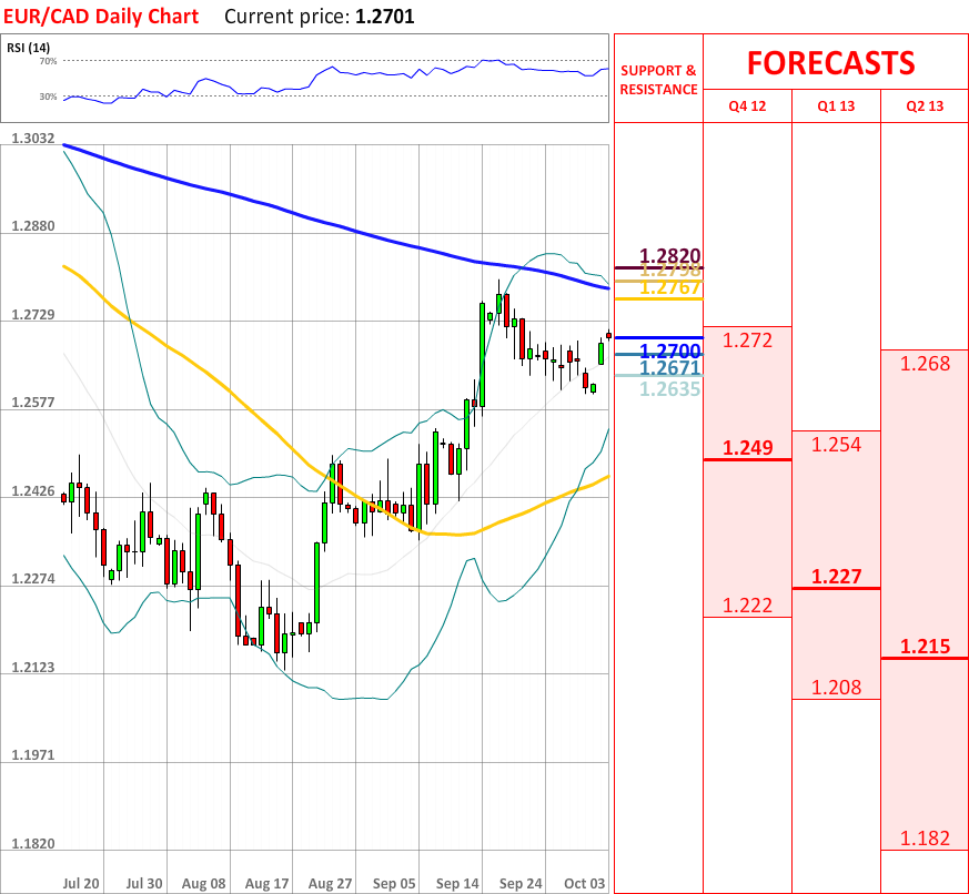 OutlookToday the EUR/CAD currency pair experienced another bullish correction, and at the particular moment the currency couple is heading towards the 200-day SMA at 1.2767, which is likely to slow down the rally. In case it fails to stop the uptrend, then the price is likely to reach the upper Bollinger band at 1.2798, which in turn is expected to reverse the prevailing movement upwards. Moreover, the overall indicator outlook is positive, therefore supporting the prevailing bullish tendency.