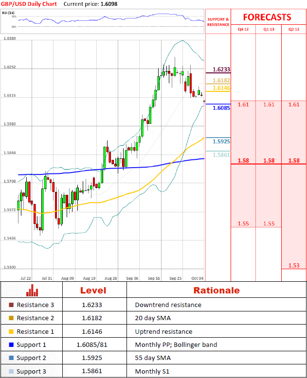 After a little hesitation GBP/USD breached an uptrend support line, implying its propensity to decline further. The nearest hurdle lies at 1.6085/81, encounter with which may invoke a shallow rally, but is highly unlikely to turn into a reversal. The present negative bias is also supported by monthly indicators and banks' forecasts for the next three quarters.