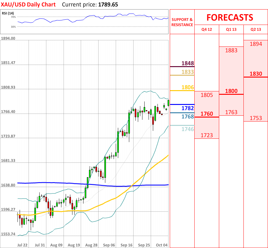 OutlookThe uptrend, which started three days ago, successfully managed to continue, as today the XAU/USD exchange rate experienced another bullish advance, and the price at the particular moment is gradually approaching the monthly R1 at 1806, which might bring some bearish impulse. In case it fails to slow down the uptrend, then the exchange rate is likely to reach the weekly R3 at 1833, which in turn will probably reverse the current movement upwards. Moreover, the overall indicator outlook is neutral, and present supports are at 1782, 1768 and 1746, and they seem to be safe for now.