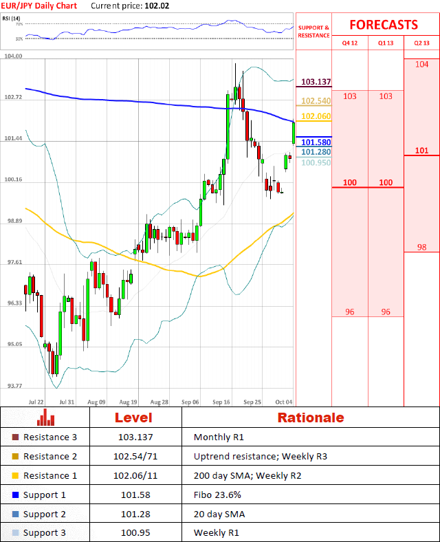Pair is continuing its rally after bouncing from major (psychological level) at 100 and is moving to form what seems to be a double top. Lower levels were not hard task, but as pair approaches resistance levels above 102.5 it seems that we will see a loss in momentum and few choppy sessions would not be a surprise as well. Current stop at 200 day SMA/weekly R2 at 1.0206 might be start of one of such sessions.