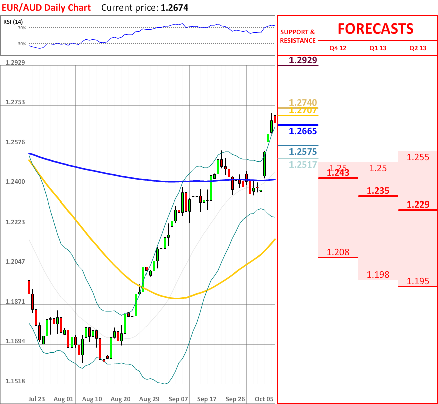 The bullish trend, which started three days ago, failed to continue, as today EUR/AUD experienced a slight bearish reaction, and at the particular moment the price is about to test the upper Bollinger band at 1.2665, which might bring some bullish impulse. In case it is breached, then the currency pair is likely to reach the weekly R3 at 1.2575, which in turn will probably stop the prevailing movement downwards. Moreover, the overall indicator outlook is neutral, and current resistances are at 1.2707, 1.2740 and 1.2929, and they seem to be secure for now.