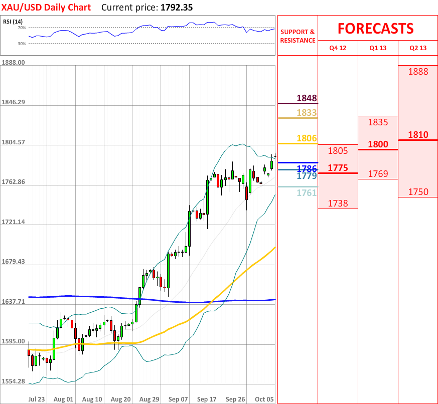 Today the interim uptrend failed to continue, as the XAU/USD exchange rate experienced a small bearish decline. As for now, the price confronts the upper Bollinger band at 1786, which might bring some bullish impetus. In case it is breached, then the price might reach the weekly R1 at 1779, which in turn will probably slow down the prevailing bearish tendency. In addition, the overall indicator outlook is neutral, and it is not expected to change in the nearest future.