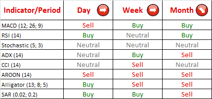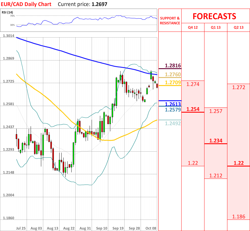 Today the EUR/CAD currency pair experienced another bearish decline, which has managed to cross the 20-day SMA, and now the price is slowly approaching the weekly R1 at 1.2613, which might bring some bullish impulse. If it fails to stop the downtrend, then next support at 1.2579 (lower Bollinger band) will probably reverse the direction of the prevailing bearish tendency. Additionally, RSI indicator now shows a buy signal, although the overall indicator outlook still is neutral.