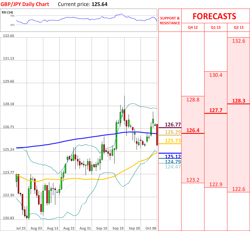 The bullish tendency, which started a couple of days ago, did not manage to continue, as today the GBP/JPY currency couple experienced a huge bearish reaction, which has managed to break the 200-day SMA at 126.29. As for now, the currency pair about to test the 55-day SMA at 125.12, which is very likely to bring some bullish impetus. In case it is breached, then the price might reach the lower Bollinger band at 124.79, which in turn will probably stop the prevailing movement downwards. Nevertheless, the overall indicator outlook is neutral, and it is not expected to change in the nearest future.