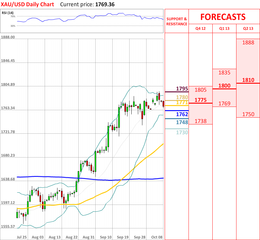 The downtrend, which started a couple of days ago, successfully managed to continue, as today the XAU/USD exchange rate experienced another movement downwards, which has already managed to overcome the 20-day SMA at 1771, and at the particular moment the price is about to test the weekly S1 at 1762, which might change the direction of the current movement. In case it is broken, then the exchange rate is likely to reach the lower Bollinger band at 1748, which will probably stop the prevailing downtrend. Moreover, the overall indicator outlook is positive, therefore a trend reversal might occur in the nearest future.
