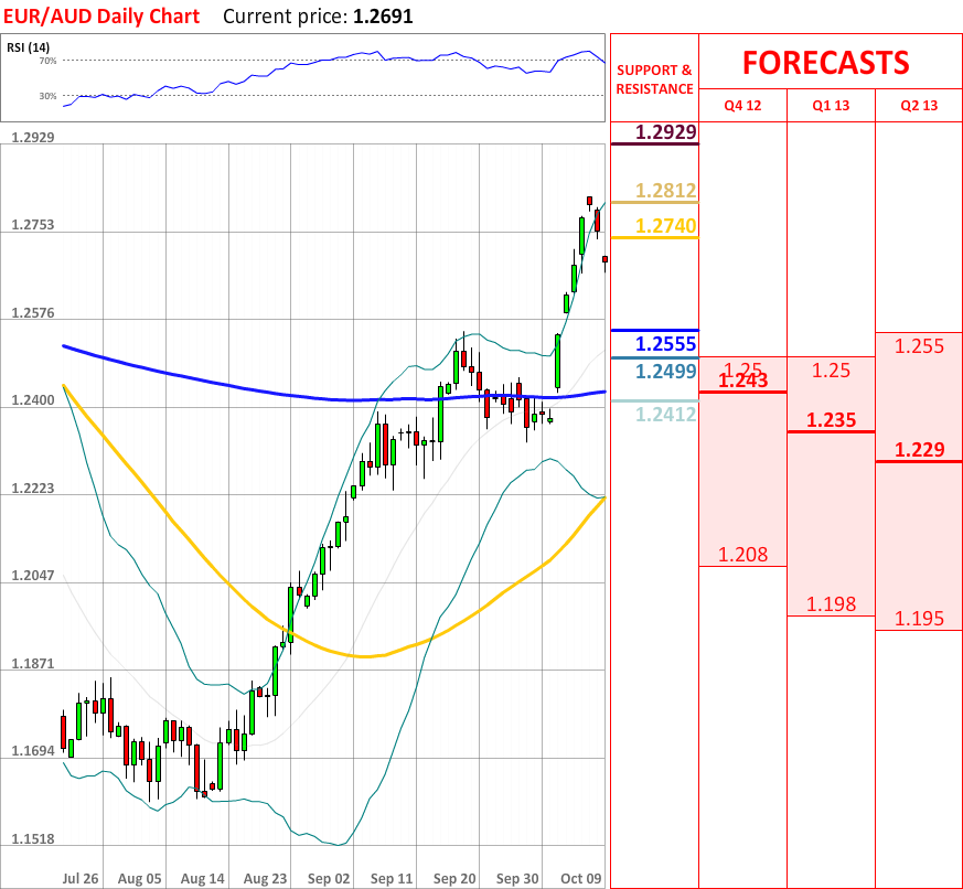 The downtrend, which started a couple of days ago, successfully managed to prevail, as today EUR/AUD has already managed to drop below the weekly PP, and at the particular moment the price is heading towards the monthly R1 at 1.2555, which might bring some bullish impetus, however, if it fails to stop the downtrend, then next resistance at 1.2499 (weekly S1) will probably slow down the current movement downwards. In addition, the overall indicator outlook now is bullish, therefore a soon trend reversal might happen.