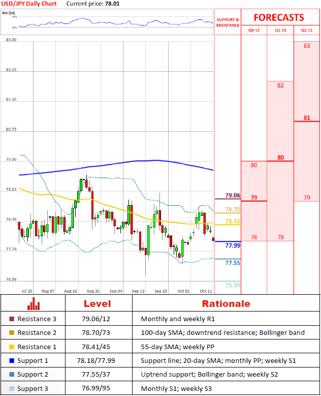 Support at 78.14/77.99 appears to be unable to stop depreciation of the U.S. Dollar, implying that USD/JPY may fall as low as 77.55/37 in near future, since there are no more notable levels in-between. If the currency pair still steps lower, however, it may challenge 76.99/95, although long-term outlook remains bullish, the view that is supported by forecasts for the next three quarters.
