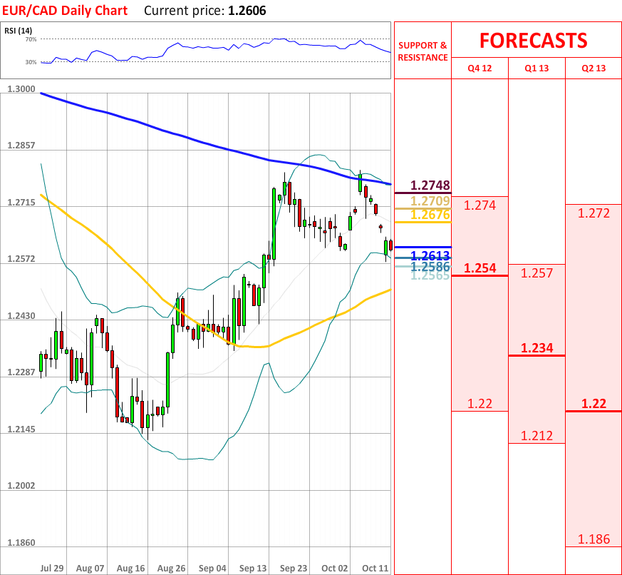 OutlookThe uptrend, which started yesterday, successfully managed to continue, as today the EUR/CAD currency couple experienced another bullish correction. As for now, the price is heading towards the 20-day SMA at 1.2676, which will probably bring some bearish momentum. In case it is breached, then the currency pair might reach the weekly PP at 1.2709, which in turn is likely to change the direction of the current tendency. Nevertheless, RSI indicator shows a neutral signal, as well as the overall indicator outlook now is neutral.