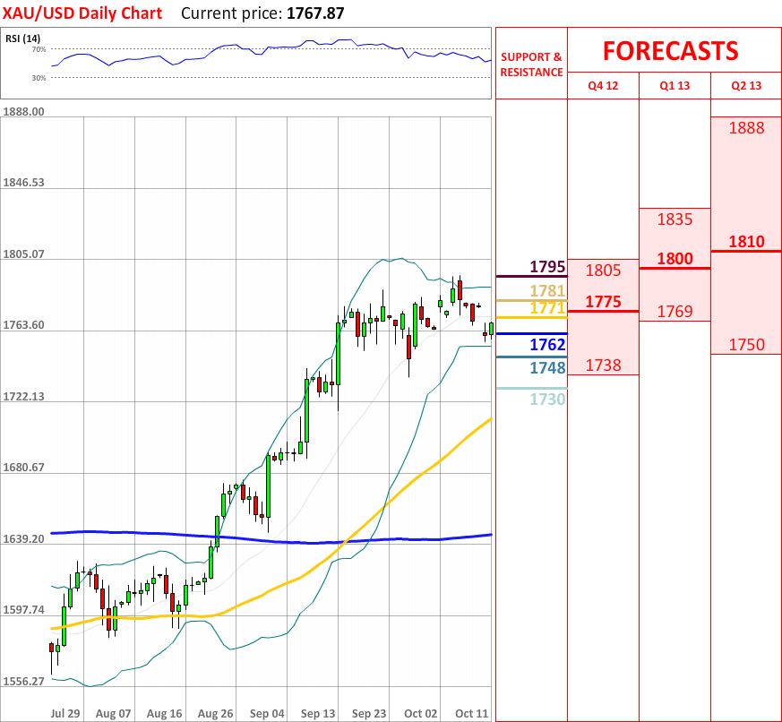 OutlookThe interim bearish trend failed to continue, as today the XAU/USD exchange rate experienced a significant bullish correction. At the particular moment the price is heading towards the 20-day SMA at 1771, which might stop the current movement upwards. In case it fails to slow down the rally, then the exchange rate is expected to reach the upper Bollinger band, which in turn is very likely to reverse the prevailing uptrend. Additionally, RSI indicator shows a neutral signal, although the overall indicator outlook remains positive.