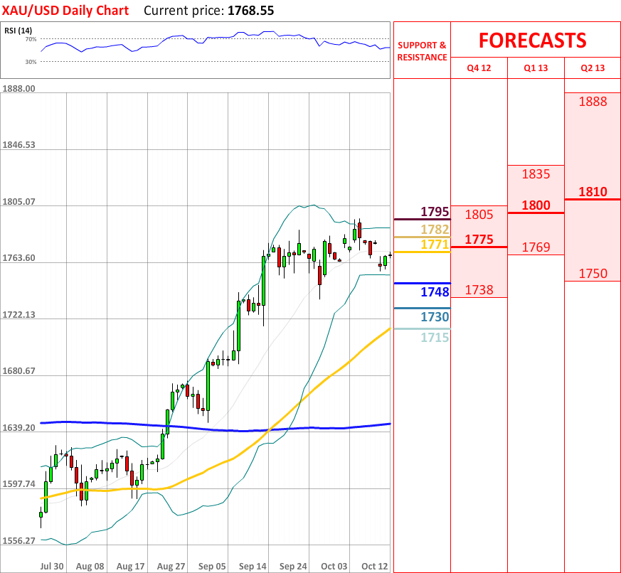 OutlookThe bullish correction, which started a couple of days ago, has failed to continue, and today the XAU/USD exchange rate experienced a slight bearish reaction. As for now, the exchange rate is gradually heading towards the lower Bollinger band at 1748, which will probably change the direction of the current movement. If it is breached, then the price is likely to reach the weekly S3 at 1730, which in turn might bring some bullish impulse. Moreover, the overall indicator outlook has changed from neutral to bullish, therefore a trend reversal should be expected in the nearest future.