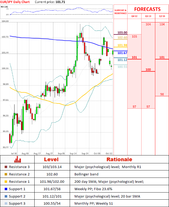 Pair is continuing bullish rally after receiving a push from Fibonacci retracement (38.2% of 25th of July—17th of September move) at 100.17 yesterday and is trying to step up and breach 102. It is likely pairs advancement will continue until it approaches higher resistance levels at 102.6 and higher.