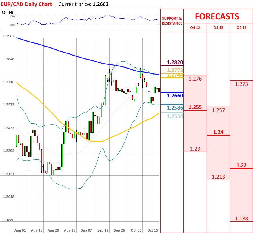 OutlookThe uptrend, which started a couple of days ago, has failed to continue, as today the EUR/CAD currency couple experienced a slight bearish reaction. As for now, the currency pair is about to test the weekly PP at 1.2660, which is likely to bring some bullish impulse. If it fails to stop the uptrend, then the price might reach the lower Bollinger band at 1.2586, which is expected to change the direction of the prevailing bearish tendency. Additionally, RSI indicator shows a neutral signal, as well as the overall indicator outlook is still neutral.