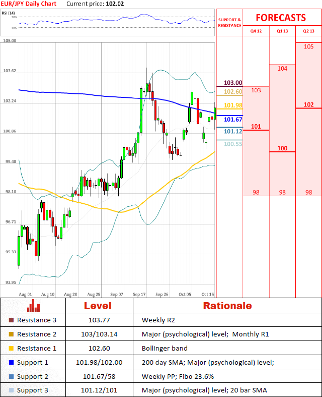 Bullish impetus on the pair is strong after weekend as pair is trying to breach 102 level with intention to advance at least to the 5th of October high at 102.79. Although technical indicators point at appreciation of the pair it still will have to pass the barrier of Bollinger band at 102.6 which is likely to slow down pair's advance.