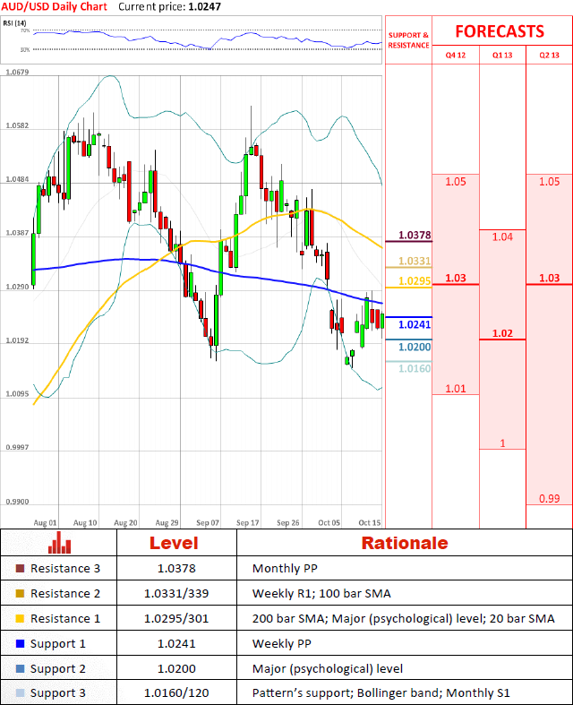 Pair was posing for a dip, but received a push up from 1.02 and is currently hovering slightly above weekly PP at 1.02041. However, pair is showing substantial downside risk and is likely to attempt to breach cluster of support levels at 1.0160 some time soon.