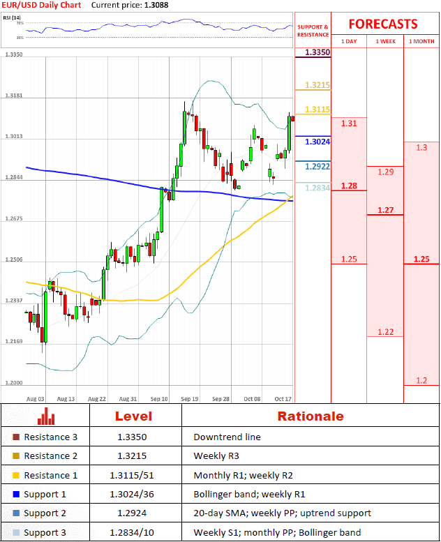 EUR/USD pair has strongly bounced from the uptrend line and weekly PP at 1.2925 and surged till 1.3115 support zone. Currently price is fluctuating in 1.3110/1.3090 zone, where the upper Bollinger band line, weekly R2 lie and the previous high's support zone is placed. Also, RSI has value of 63.7 and comes very close to an oversold zone; however, weekly time frame still has power to push price higher.