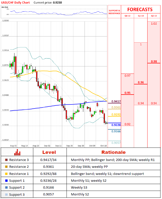 USD/CHF pair experienced a consolidation during the yesterday's trading session, when price was stuck on 0.9228 support level. As the price breached the lower Bollinger band line, together with RSI value of 35, it is very likely to see some correction impetus in this currency pair soon. A possible resistance level for that would be 0.9292.