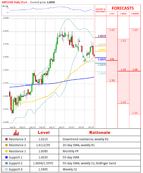 As GBP/USD was not able to brake through 1.6115/35 resistance level a few days ago, thus the price was forced to sharply retreat back and test lowers support levels. The current price is 1.6060 and fluctuates around the weekly PP. If this level is not sufficient to support the price retreatment, the next support zone will be at 1.6004/1.5970, where the 55-day SMA, weekly S1 and a Bollinger band lie.