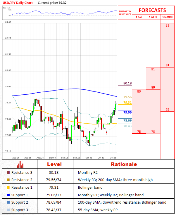 USD/JPY has slowed the pace of appreciation, but still stays on the upside track and advances further. As the currency pair overcame 79.06/13 resistance level, it is very possible to see the price testing 79.56/74 in the near future. However, that might be done after some swings, because RSI has a value of 68.9 in a D1 graph and 70.2 in a H4 graph.