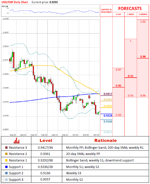 USD/CHF pair found a strong enough support level at 0.9228 to form a channel with an upper line at 0.9241. Currently the price is around the upper channel line, where the monthly S1 lies and is trying to brake through it. RSI value is very close to a 30 mark, but is still not reached, thus it is very possible to see USD/JPY testing the lower channel line soon.