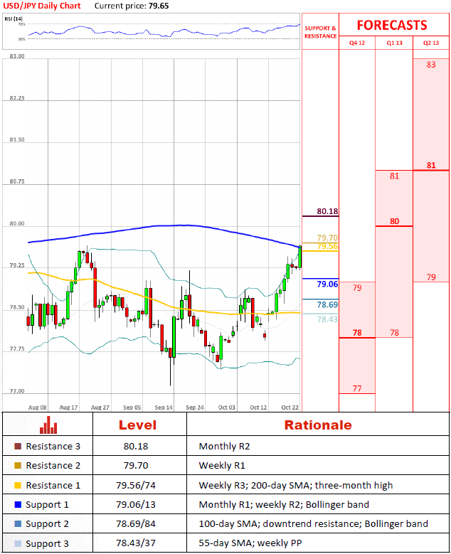 Friday trading session showed some consolidation sighs and a pace of appreciation slowed down, but from the very beginning of a new week, USD/JPY continues to surge and have already reached 79.65 price level. Looking from a historical perspective, 79.56/74 zone has always maintained strong resistance levels, therefore there is very likely that USD/JPY will show a stronger correction impetus after reaching this level. Also, RSI has a value of 71, which tempts about an overbought zone.